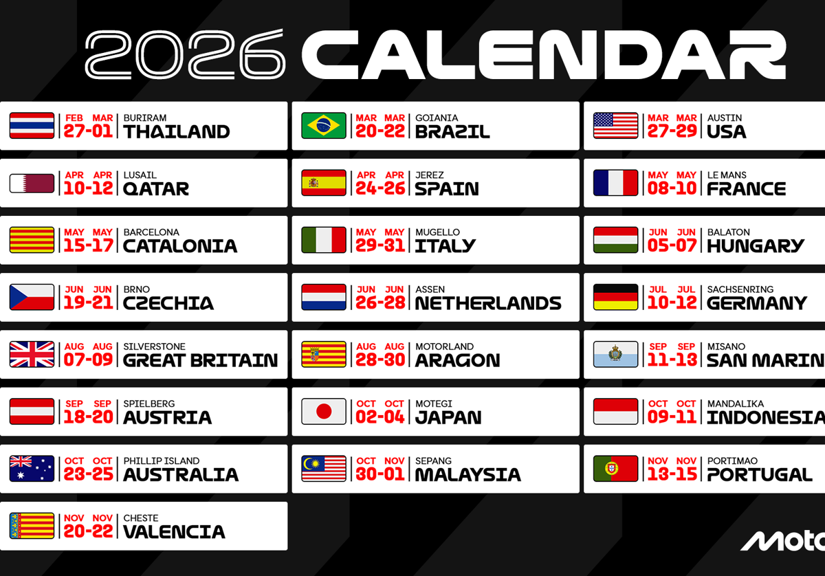 La temporada 2026 arrancará en Tailandia, antes de trasladarse al continente americano para las primeras carreras en Brasil y Estados Unidos. El circuito de Catar también volverá a ser uno de los destinos del campeonato, mientras que el circuito de Jerez abrirá las puertas de Europa con el Gran Premio de España a finales de abril.