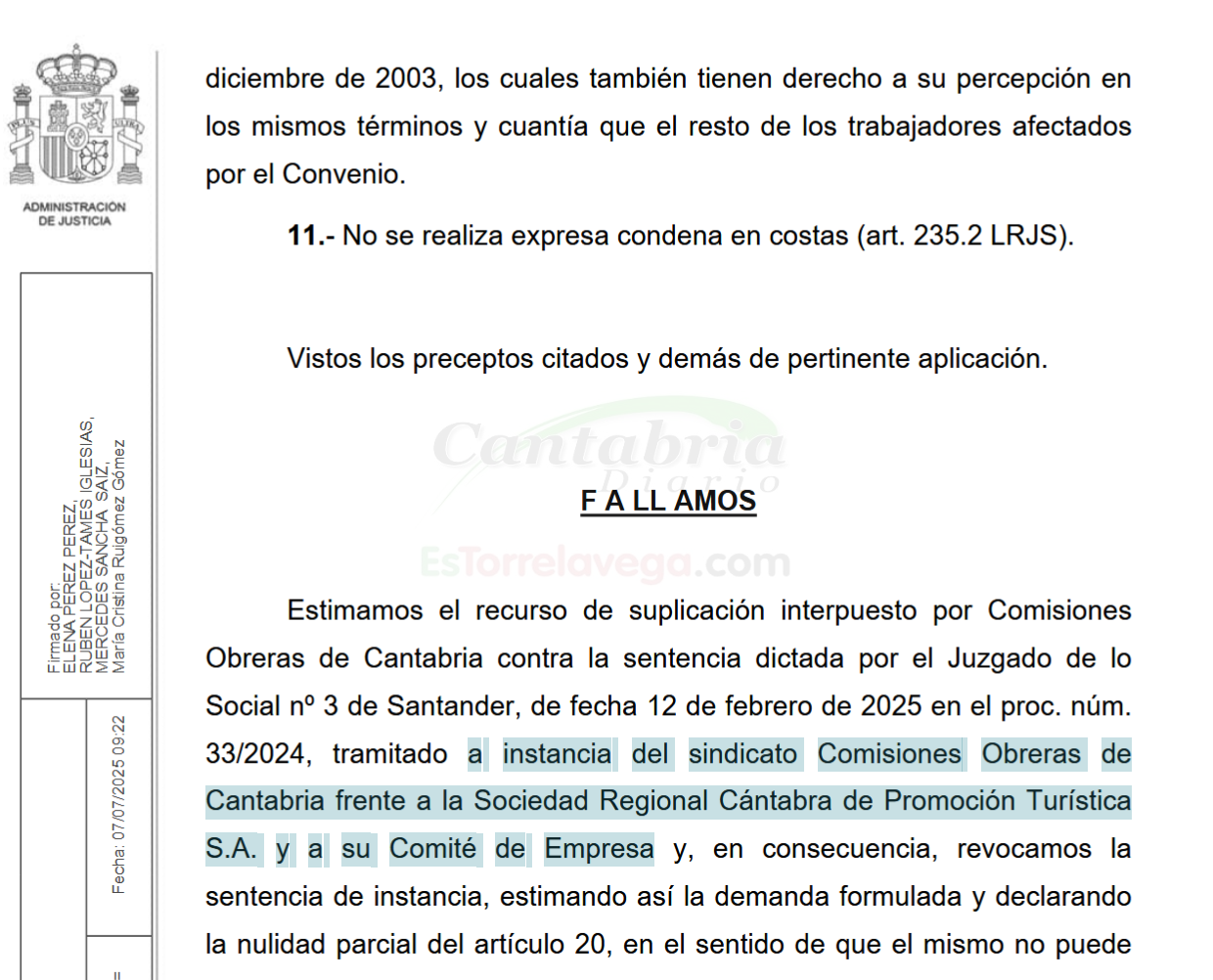 La Sala de lo Social del Tribunal Superior de Justicia de Cantabria ha dictado una sentencia que obligará a la empresa pública CANTUR a abonar el complemento de antigüedad a toda su plantilla. Esta decisión se ha tomado tras declarar la nulidad parcial del artículo 20 del convenio colectivo de la empresa, que excluía de este derecho a los trabajadores que ingresaron después del 31 de diciembre de 2003.