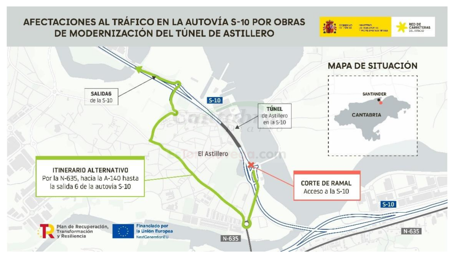 Los cortes programados incluyen el túnel de Astillero en dirección a Bilbao y San Santander en distintas noches. Además, el ramal de la salida 7 de la autovía S-10 será cortado el 12 y 13 de noviembre entre las 10:00 y las 17:00 horas. Las autoridades han establecido itinerarios alternativos, claramente señalizados, para garantizar el flujo de tráfico hacia Torrelavega y Bilbao.